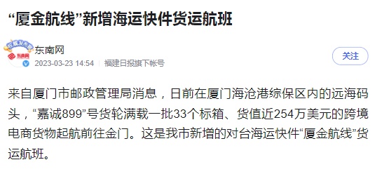 3月23日消息,厦门市近日新增对台海运快件“厦金航线”,在厦门海沧港综保区内的远海码头,“嘉诚899”号货轮满载一批33个标箱、货值近254万美元的跨境电商货物启航前往金门。据了解,厦门跨境电商监管中心自落地以来,打造了跨境电商“场所+码头+航线”模式,实现跨境电商仓储、通关、干线功能一体化,让货物能“即验放即...