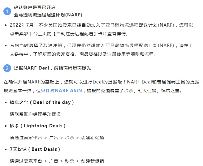 一、顺利实现一库三售跨境电商市场竞争加剧,卖家们不想放过任何一个可实现销售增长的新机遇。近日,渴望加大力度布局北美市场的亚马逊卖家又迎来了一个好消息。亚马逊官方发布公告称:“将更新亚马逊物流远程配送计划(NARF),推出全新功能‘NARF Deal’。”具体来看,在这项新功能推出后,美国站的NARF ASIN也能提报加拿...
