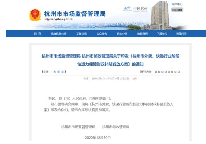 近日,浙江省杭州市邮政管理局、市场监督管理局联合出台《杭州市外卖、快递业阶段性运力保障财政补贴发放方案》,向在岗快递员、外卖员发放补贴,其中将有1500万元直接发放到一线快递员手中。此次财政补贴时间为2023年1月1日至1月10日,为期10天。申请补贴的邮政、快递企业须依法取得快递业务经营许可资质。领取邮政快递业补...
