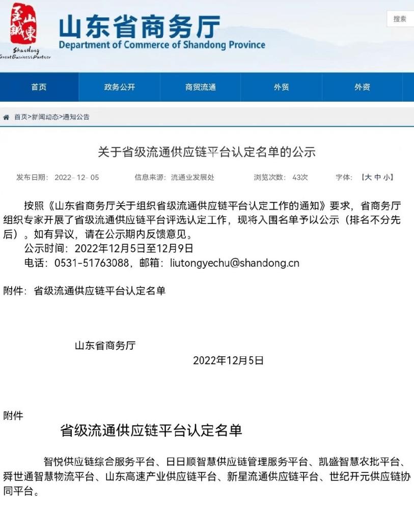 日前,为加快建设山东省现代流通体系,服务构建新发展格局,山东省商务厅组织专家就省级流通供应链平台展开评选认定工作,具体名单现已公布。日日顺智慧供应链服务平台凭借为现代商贸流通企业提供覆盖供应链全流程方案设计及管理解决方案的能力成功入选,一体化供应链管理服务模式再获认可。无流通,不经济。现代商贸流通业...
