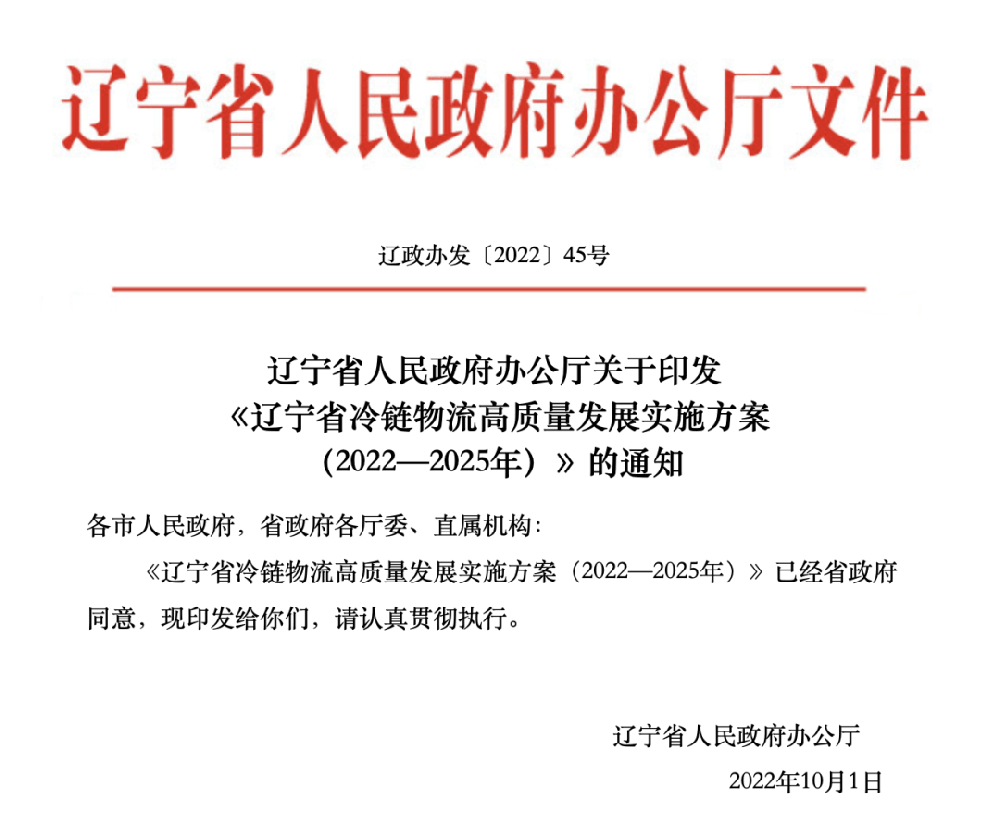 10月11日,辽宁省人民政府办公厅印发《辽宁省冷链物流高质量发展实施方案(2022—2025年)》的通知(以下简称《实施方案》)。按照《实施方案》的要求,到2025年,初步形成产销衔接顺畅、城乡全面覆盖、内外双向联通的冷链物流网络,基本建成符合辽宁省省情和产业结构特点,适应经济社会发展的冷链物流体系;冷链物流基础设...