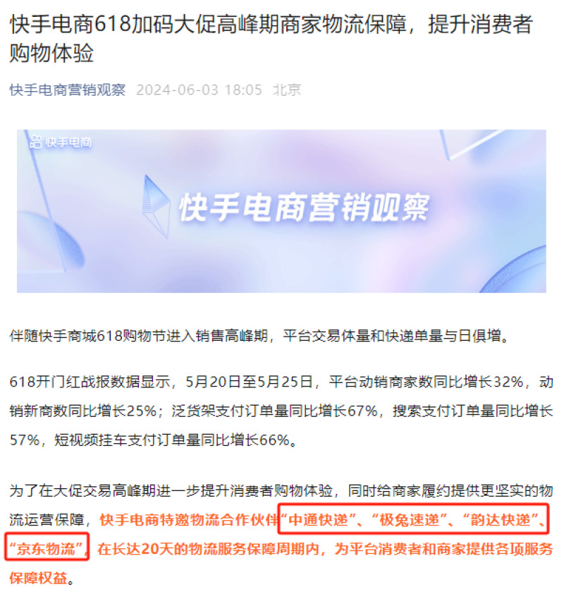 为了在618大促交易高峰期进一步提升消费者购物体验,同时给商家履约提供更坚实的物流运营保障,快手电商特邀物流合作伙伴“中通快递”、“极兔速递”、“韵达快递”、“京东物流”,在长达20天的物流服务保障周期内,为平台消费者和商家提供各项服务保障权益。据了解,特邀物流合作伙伴的保障周期为支付时间在6月1日至6月18...