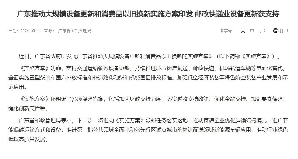 广东省政府近日印发《广东省推动大规模设备更新和消费品以旧换新的实施方案》(以下简称《实施方案》)。《实施方案》明确,支持交通运输领域设备更新。持续推进城市物流配送、邮政快递、机场转运车辆等电动化替代。全面实施重型柴油车国六排放标准和非道路移动柴油机械国四排放标准。加强低空经济装备等绿色航空装备产业发...
