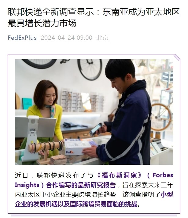联邦快递近日发布了与《福布斯洞察》(Forbes Insights)合作编写的最新研究报告,旨在探索未来三年内亚太区中小企业主要跨境增长趋势。该调查指明了小型企业的发展机遇以及国际跨境贸易面临的挑战。本次调查访问了来自亚太地区不同行业的250名中小型企业负责人,包括创始人及企业高管。报告的核心发现显示,68%的受访者认为...
