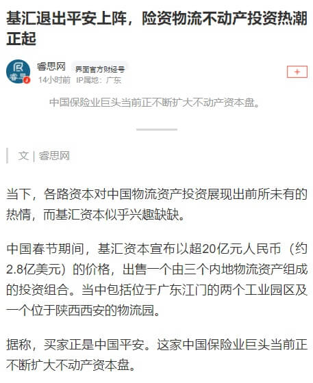 基汇资本日前宣布以超20亿元人民币(约2.8亿美元)的价格,出售由三个内地物流资产组成的投资组合,当中包括位于广东江门的两个工业园区及一个位于陕西西安的物流园。据媒体报道,该物流资产组合的买家为中国平安。图源:睿思网2月19日,平安人寿公告显示,平安人寿收购鹤山市合能商贸有限公司、维龙供应链管理有限公司等公...