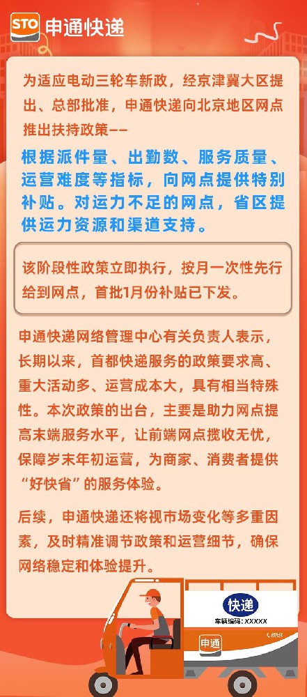 为适应电动三轮车新政,经京津冀大区提出、总部批准,申通快递向北京地区网点推出扶持政策,根据派件量、出勤数、服务质量、运营难度等指标,向网点提供特别补贴。对运力不足的网点,省区提供运力资源和渠道支持。该阶段性政策立即执行,按月一次性先行给到网点,首批1月份补贴已下发。图源:申通之声公众号申通快递网络管理...
