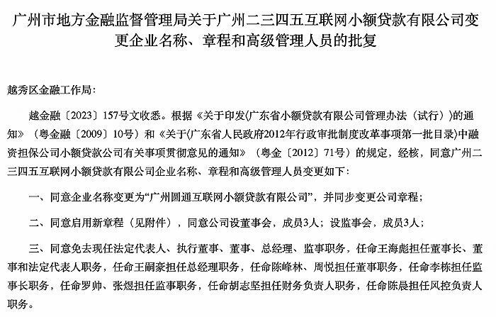 广州市地方金融监督管理局在近日发布关于广州二三四五互联网小额贷款有限公司变更企业名称、章程和高级管理人员的批复。同意企业名称变更为“广州圆通互联网小额贷款有限公司”,并同步变更公司章程;公司设董事会,成员3人;设监事会,成员3人。同意免去现任法定代表人、执行董事、董事、总经理、监事职务,任命王海彪担任...