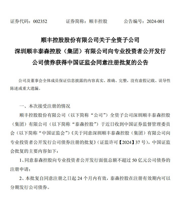 顺丰控股宣布,证监会同意全资子公司泰森控股向专业投资者公开发行面值总额不超过50亿元公司债券的注册申请。深圳顺丰泰森控股(集团)有限公司在注册有效期内可以分期发行公司债券,该批复自同意注册之日起24个月内有效。公告显示,顺丰分别于2022 年3月30日、2022年4月29日召开第五届董事会第二十三次会议及 2021年年度股东...