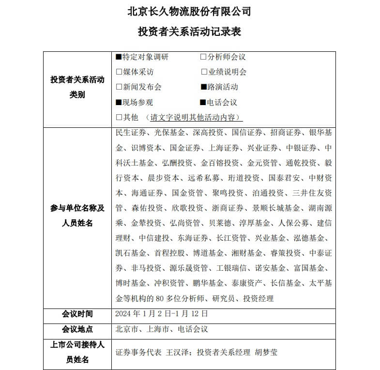 北京长久物流股份有限公司(证券简称“长久物流”)近日接受机构调研活动,并披露投资者关系活动记录表(2024年1月2日-1月12日),围绕公司2023年前三季度经营情况,公司管理层与投资者进行了充分交流,主要涉及2023年前三季度公司财务情况、V2G技术应用、滚装船市场展望、大数据等方面。图源:上交所网站1、2023年前三季度...