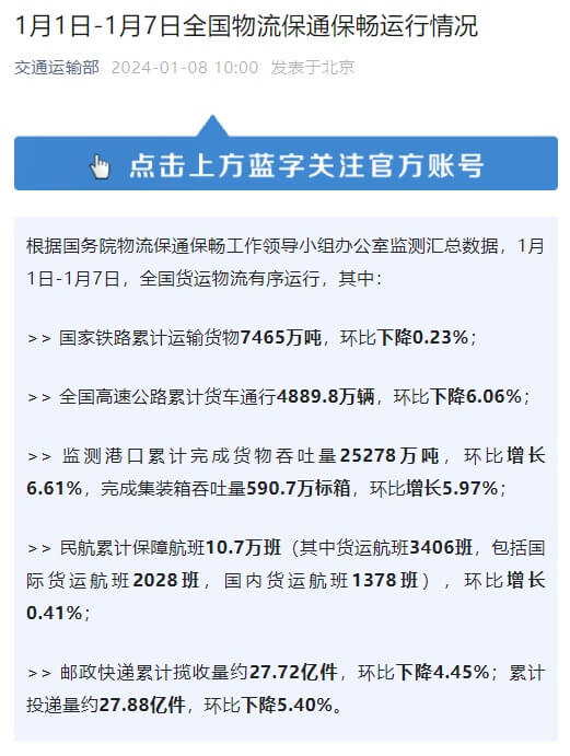 根据国务院物流保通保畅工作领导小组办公室监测汇总数据,1月1日-1月7日,国家铁路累计运输货物7465万吨,环比下降0.23%;全国高速公路累计货车通行4889.8万辆,环比下降6.06%;监测港口累计完成货物吞吐量25278万吨,环比增长6.61%,完成集装箱吞吐量590.7万标箱,环比增长5.97%。邮政快递累计揽收量约27.72亿件,环比下降...