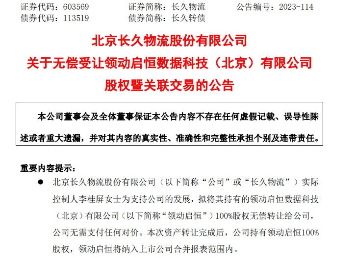 长久物流公告称,公司实际控制人李桂屏为支持公司的发展,拟将其持有的领动启恒数据科技(北京)有限公司(以下简称“领动启恒”)100%股权无偿转让给公司,公司无需支付任何对价。本次资产转让完成后,公司持有领动启恒100%股权,领动启恒将纳入上市公司合并报表范围内。截自长久物流关于无偿受让领动启恒股权暨关联交易的...