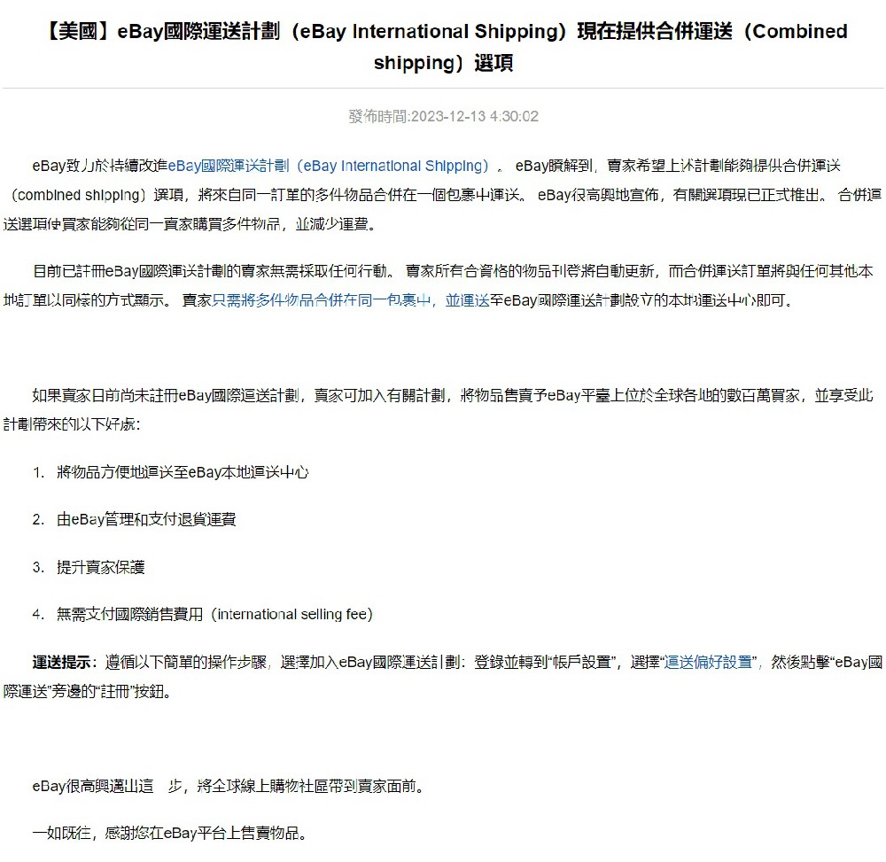 eBay发布公告称,eBay致力于持续改进eBay国际运送计划(eBay International Shipping),在美国,其新选项合并运送(combined shipping)现已正式上线,该选项可以将来自同一订单的多件物品合并在一个包裹中运送。合并运送选项使买家能够从同一卖家购买多件物品,并减少支付运费。目前已注册eBay国际运送计划的卖家无需采取...