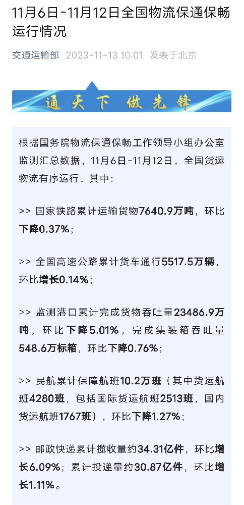 根据国务院物流保通保畅工作领导小组办公室监测汇总数据,11月6日-11月12日,全国货运物流有序运行,其中,国家铁路累计运输货物7640.9万吨,环比下降0.37%;全国高速公路累计货车通行5517.5万辆,环比增长0.14%;监测港口累计完成货物吞吐量23486.9万吨,环比下降5.01%,完成集装箱吞吐量548.6万标箱,环比下降0.76%。邮政...