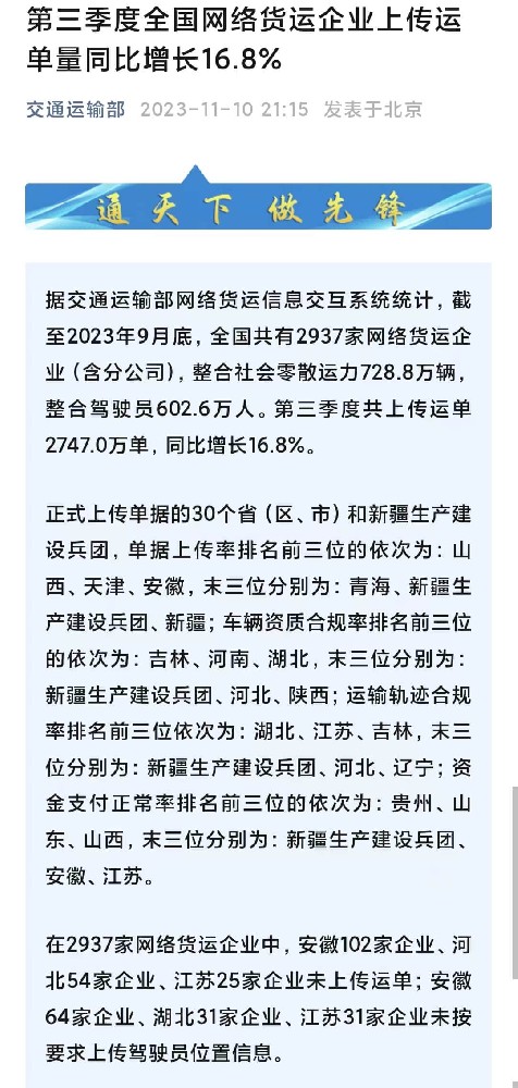 据交通运输部网络货运信息交互系统统计,截至2023年9月底,全国共有2937家网络货运企业(含分公司),整合社会零散运力728.8万辆,整合驾驶员602.6万人。第三季度共上传运单2747.0万单,同比增长16.8%。正式上传单据的30个省(区、市)和新疆生产建设兵团,单据上传率排名前三位的依次为:山西、天津、安徽,末三位分别为:...
