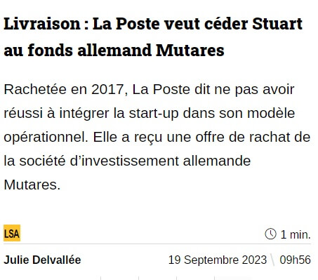 法国邮政集团(La Poste Group)的国际业务部门Geopost准备将亏损的按需投递业务Stuart出售给德国投资基金公司Mutares,理由是Stuart和Geopost的核心包裹业务缺乏协同效应。据了解,法国邮政集团于2017年通过子公司Geopost以1300万欧元收购了Stuart。然而,自收购以来,Stuart已累计亏损。Mutares发出了从Geopost收购Stuart的...