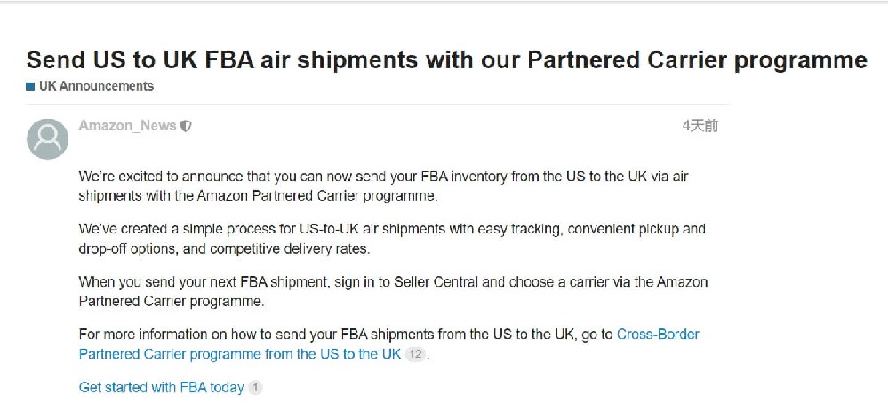 亚马逊欧洲站发布公告宣布,卖家现在可以通过亚马逊合作承运人计划通过空运将卖家的亚马逊物流(FBA)库存从美国发送到英国。亚马逊平台表示,其为美国到英国的空运创建了一个简单的流程,具有轻松的跟踪、方便的取件和投件选项以及具有竞争力的交货率。亚马逊提醒,当卖家发送下一次亚马逊物流货件时,请登录卖家中心并通过...