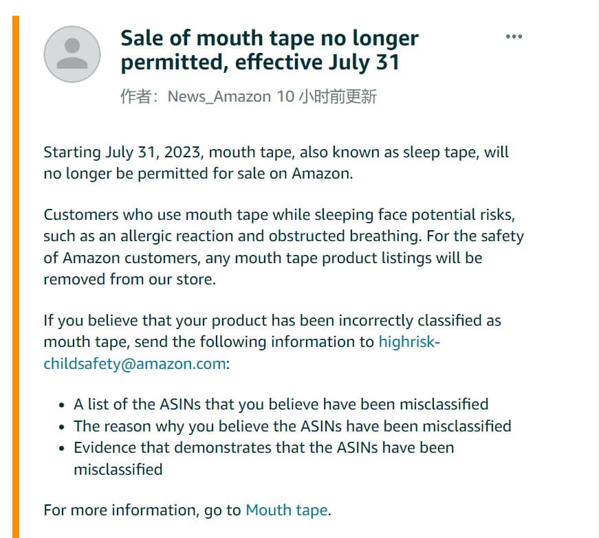 亚马逊美国站发布公告称,由于口腔胶带(睡眠胶带)在睡觉时存在潜在危险,出于对消费者的安全考虑,任何睡眠胶带产品的listing将在亚马逊商店下架。亚马逊表示,自2023年7月31日起,口腔胶带(也称为睡眠胶带)将不再允许在亚马逊上销售。睡觉时使用睡眠胶带的顾客存在潜在风险,例如过敏反应和呼吸阻塞。为了亚马逊客户的...