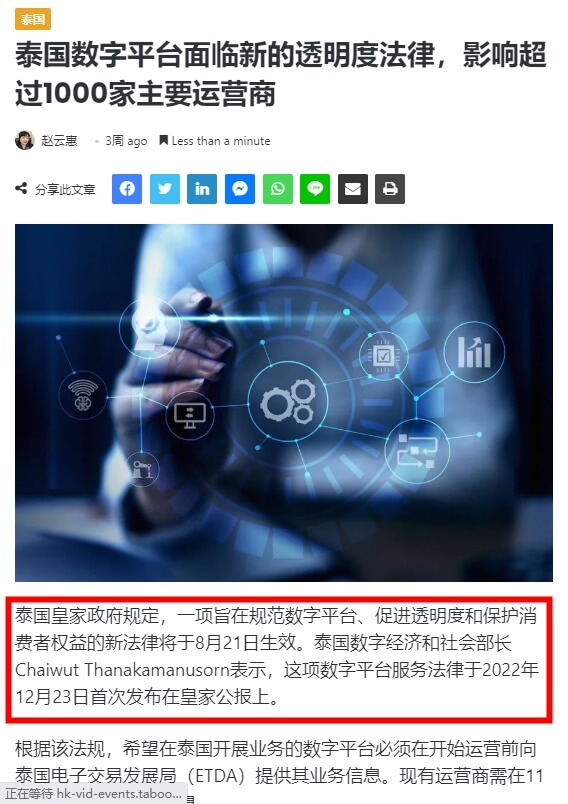 泰国数字经济与社会部(Ministry of Digital Economy and Society, Thailand,简称“DES”)部长Chaiwut Thanakmanusorn与Lazada、Shopee等数字平台运营商近日举行会议,以提高对即将实施的《关于数字平台服务业务的皇家法令》(B.E. 2565)的重要性认识。该部表示,为了用户安全和防止欺诈事件,平台可以考虑将之前的身份证...